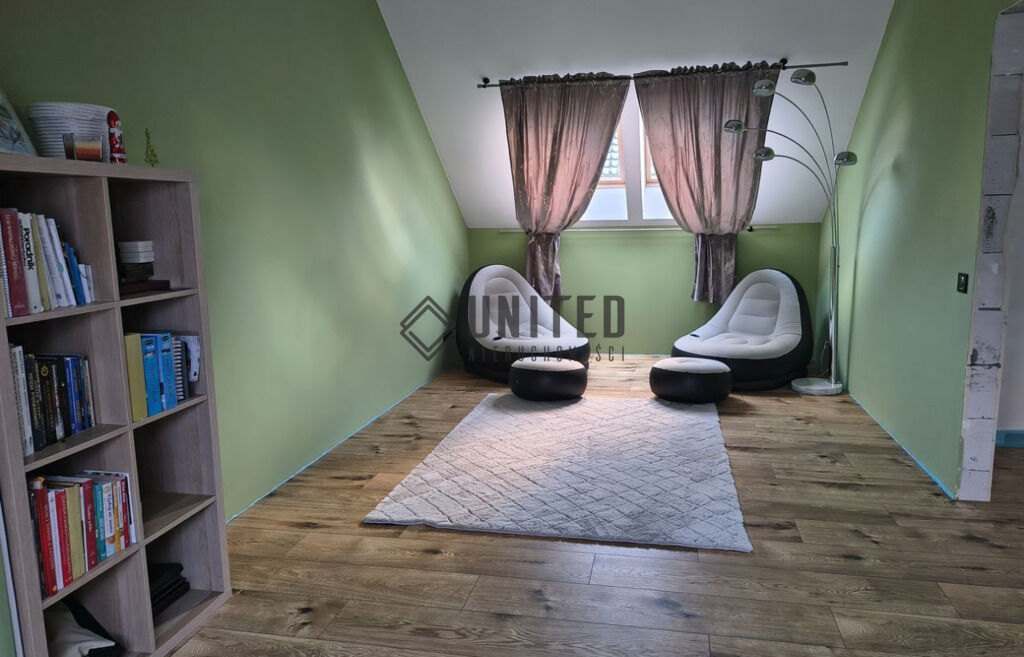 Piętro: 2 sypialnie, duży pokój, łazienka. Dodatkowo strych,